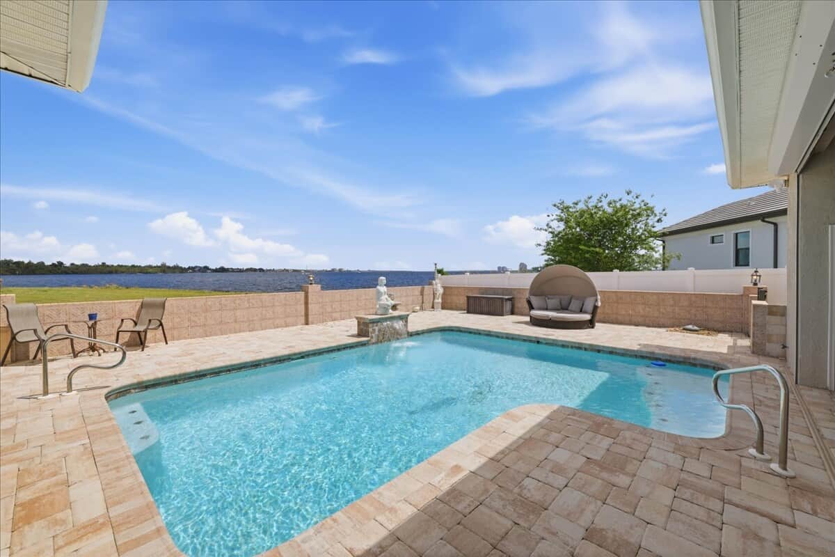 Relax at this tranquil riverfront getaway with stunning views of the Caloosahatchee River and downtown Fort Myers. The private upstairs master suite features an office space, soaking tub, dinette and refrigerator. Downstairs offers two master bedrooms with en-suite baths, including a walk-in tub. Enjoy an open living area with water views, plus a grill, pool and hot tub for the perfect relaxing stay. Be sure to catch the sunset and all the boats driving by.